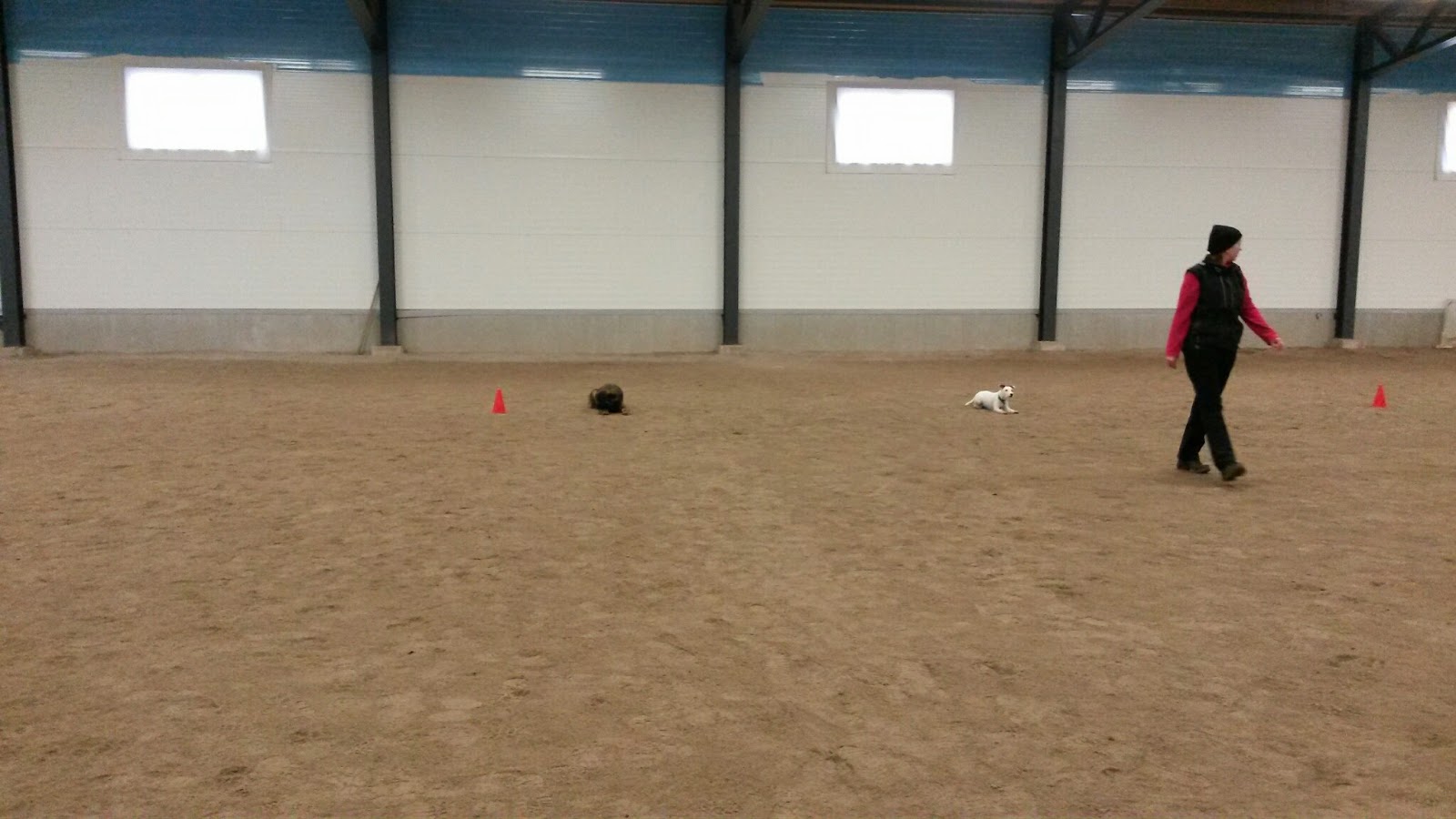 Sitten tehtiin paikkista rinnakkain ja parsoni ei pysynyt paikallaan ollenkaan, vaan tuli toistuvasti ohjaajansa luo ja Taavi ei tietenkään kestänyt tätä. Rähjärinki oli valmis =/ Toistoja tehtiin varmaan sata ja niistä suurimman osan Taavi pysyi hyvin, vaikkakin vähän luimistellen ja parsonia tuijotellen, mutta sitten ne pari kertaa kun Tapsu lähti, niin se oli ihan hirveetä. Ei me voida ikinä mennä mihinkään kokeeseen, kun pilataan kaikkien muiden paikkis sillä, että Taavi vaan ei pysy siellä jos joku muu lähtee huitelemaan. Suurimman osan toistoista palkkasin tiuhaan, jotta saisin vahvistusta sille paikallaan ololle, mutta ei se taida tuon luupään kaaliin mennä, että ei ne toiset koirat ole heti sen kimppuun tulossa, vaikka nousevatkin ylös... Yhden kerran kokeilin kahden minuutin makuuta ja se meni loistavasti minuutin ja 55 sekuntia, mutta sitten lähti parsoni vaikka kuinka monennen kerran ja Tapsu kanssa. Oli ehkä vähän liikaa vaadittu, mut tulipahan testattua.