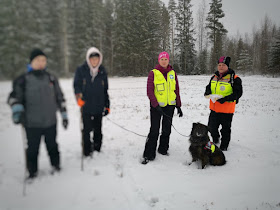 Saimme uuden alueen ja siellä kerrottiin olleen näköhavainto aamulta yhdestä kadonneesta. Näköhavaintopaikalla ei kuitenkaan ollut mitään, joten lähdimme etsimään. Taavi nosti jäljen tai itse asiassa jälkiä oli kaksi. Lumi hieman helpotti tulkitsemaan koiran toimintaa... Taavi jäljesti alueen rajalle ja sieltä otettiin yhteys johtoon, josta saimme luvan jatkaa jälkeä alueemme ulkopuolelle. Vähän ennen maalimiesten löytymistä Taavi vaihtoi ilmavainulle ja löysi kadonneet isän ja pojan.