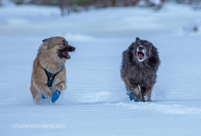 Taas hujahti pitkä tovi ilman juuri minkäänlaisia treenejä. Pakkaset on olleet kovia ja lisäksi työt on syöny taas ihan tolkuttomasti aikaa. Sunnuntaina keli ja aikataulu kuitenkin salli jääretken ja Muru otti koirista vähän kuvia. Nauttivat niin paljon, kun pääsi juoksemaan täysiä, Sinni varsinkin.